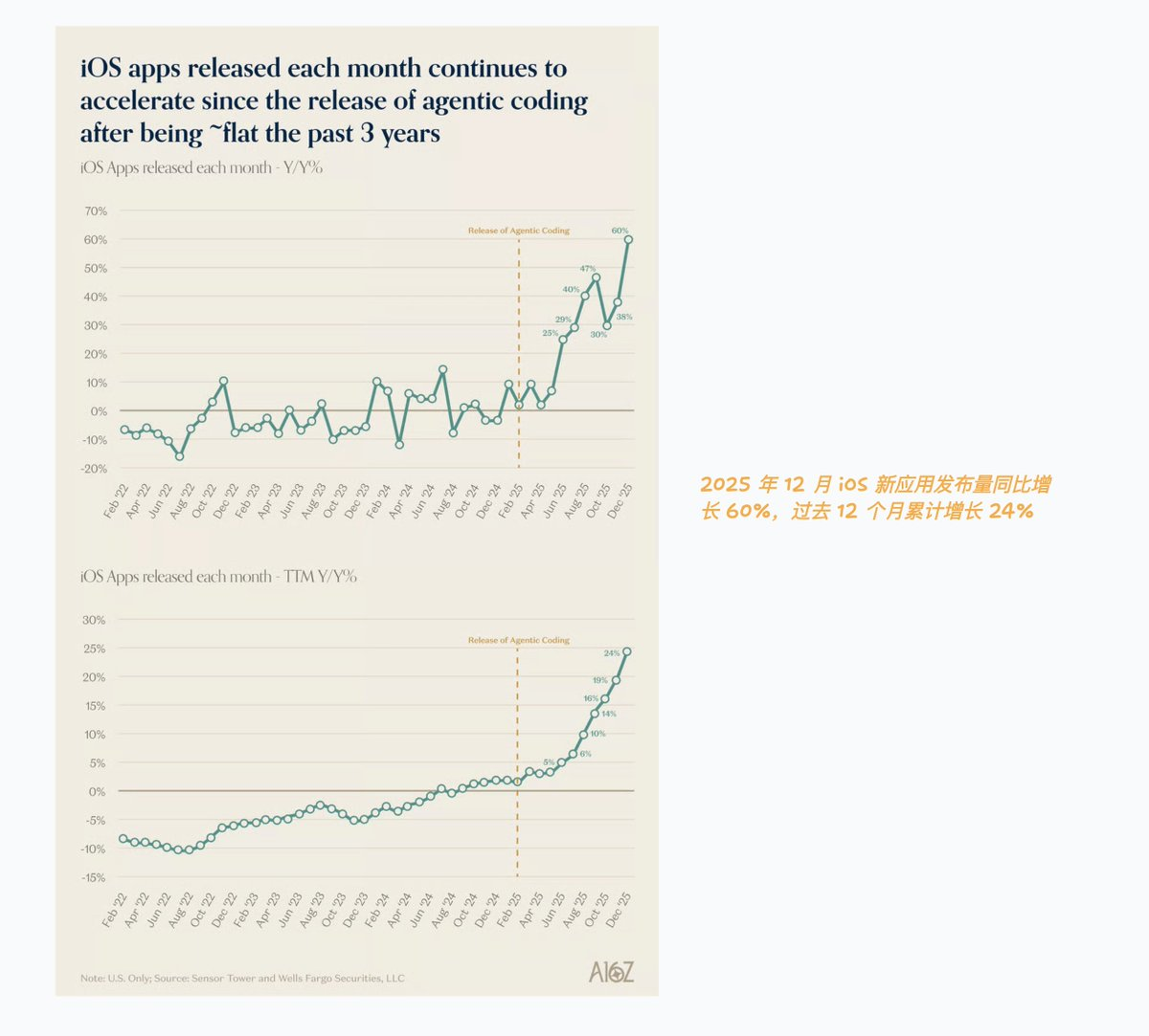 这种供给端爆炸正在当下重演。a16z 的数据显示,2025 年 12 月 iOS 新应用发布量同比增长 60%,过去 12 个月累计增长 24%——他们将这一现象归因于 agentic coding(也叫"vibe coding")的兴起。这和 2008 年 iPhone SDK 发布后的 app 爆发如出一辙:当创造门槛骤降时,供给端总会爆炸。