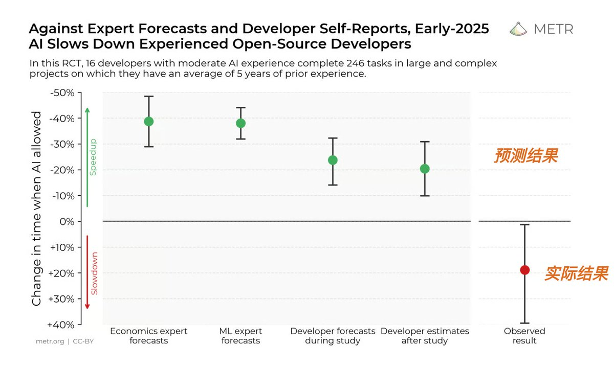 同样的悖论正在 AI coding 领域重演。METR 在 2025 年进行的一项严格随机对照实验发现:当 16 名有经验的开源开发者在自己熟悉的项目(平均维护了 5 年)上使用 AI 工具时,完成任务的时间反而慢了 19%——而实验前,这些开发者预期会快 24%。更大规模的调查显示,75% 的工程师在使用 AI 工具,但大多数组织看不到可衡量的绩效提升。原因是什么?AI 加速了代码生成这一个环节,却在代码审查、集成、测试等环节制造了新的瓶颈——就像在流水线上只加速一台机器,你得到的不是更快的工厂,而是更大的堆积。