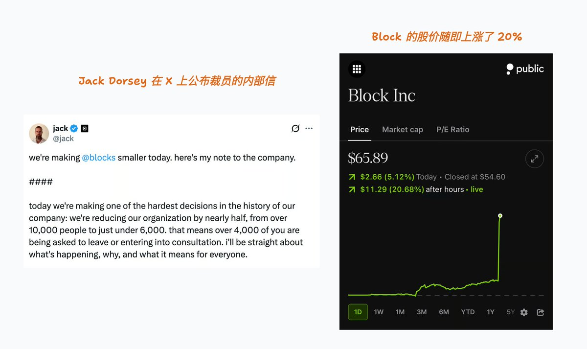 企业层面的结构性变化。 2 月 26 日,Block 创始人 Jack Dorsey 宣布将公司从 10,000+ 人裁至不到 6,000 人——砍掉超过 40%。他把裁员归因于 AI:"intelligence tools... are enabling a new way of working which fundamentally changes what it means to build and run a company." 市场的反应直截了当:股价当天暴涨 20%。