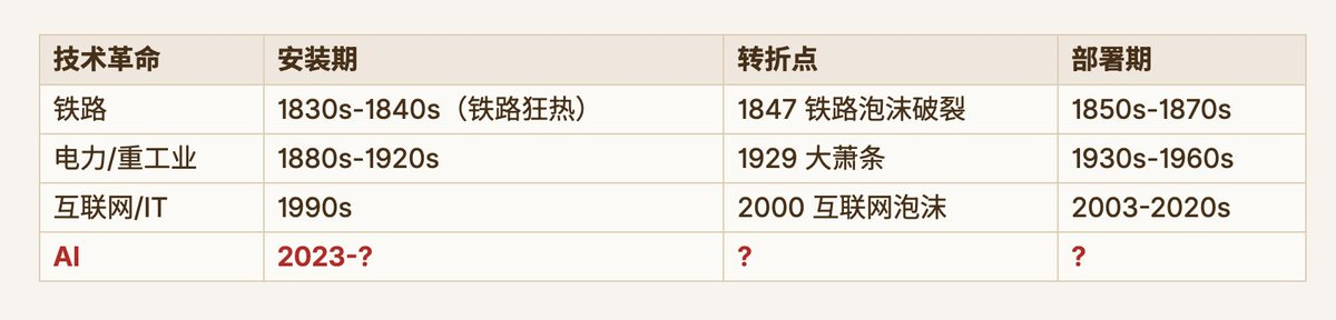 如果 Perez 的框架成立,AI 目前正处于安装期的早期——大量资本涌入、实验室遍地开花、共识赛道极度拥挤。这个阶段的特征恰恰是我们看到的景象:供给过剩、大量复制品、马太效应极强。安装期的后半段,通常会出现投机泡沫。泡沫破裂之后,才会进入真正的"部署期"——此时基础设施已经成熟,制度性框架已经适应,技术的全部潜力才开始被释放。