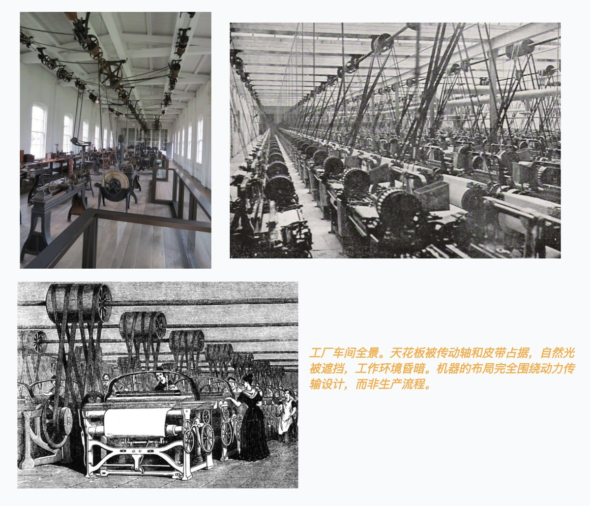 19 世纪末,工厂的动力来源是蒸汽机或水车。整个工厂的布局围绕一根巨大的中央传动轴(line shaft)设计:蒸汽机在地下室转动主轴,主轴通过皮带驱动每一层楼的机器。工厂必须建成狭长的多层建筑,所有机器必须紧密排列在传动轴附近。建造一座工厂需要巨额资本——不仅要买机器,还要自建动力系统。