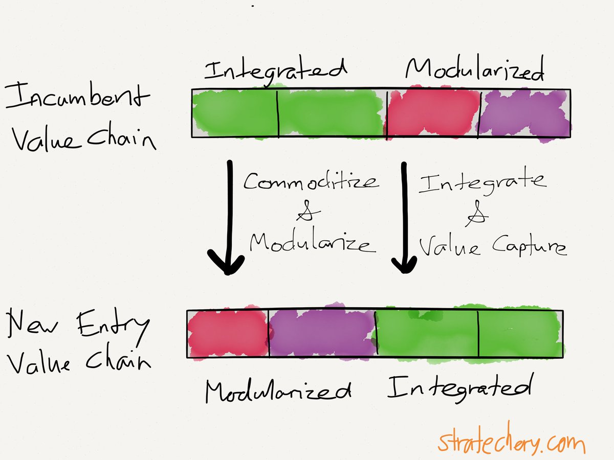 Ben Thompson 在分析 Netflix 时将这一逻辑表述得更直白:"打破原有的整合系统——商品化并模块化它——会摧毁现有企业的价值,同时让新进入者在价值链的不同部分进行整合并捕获新价值。"